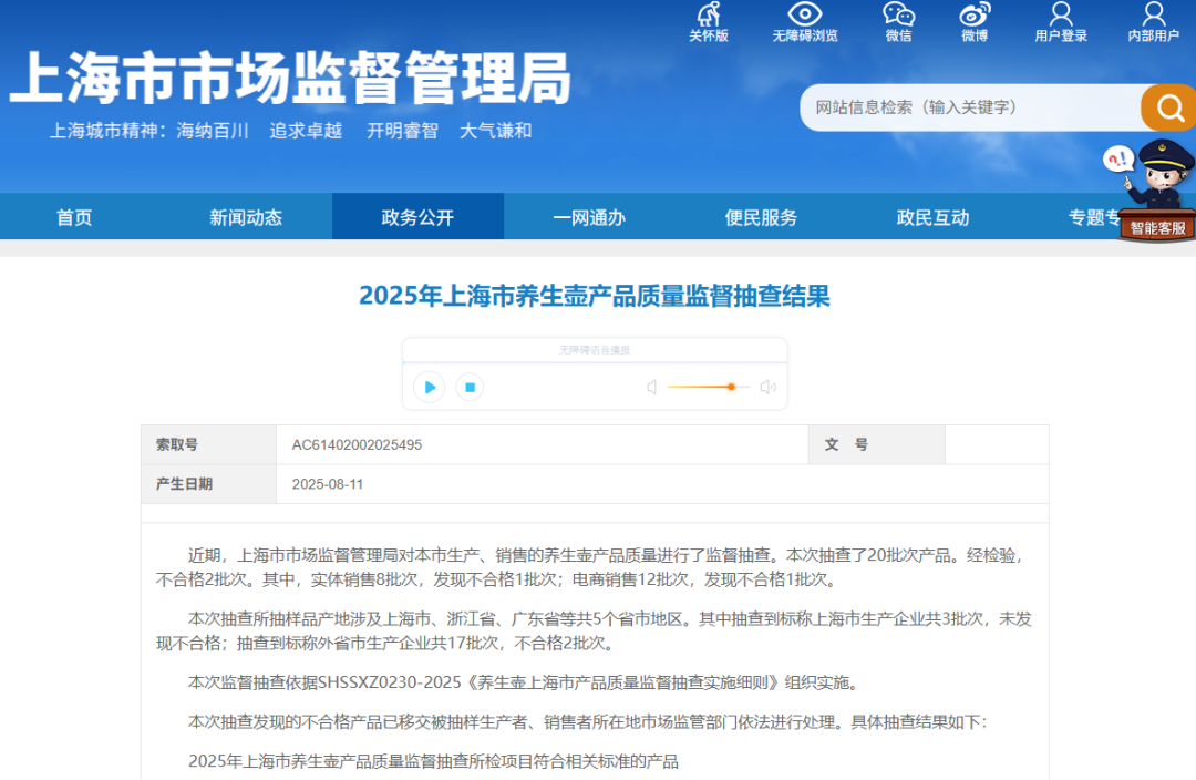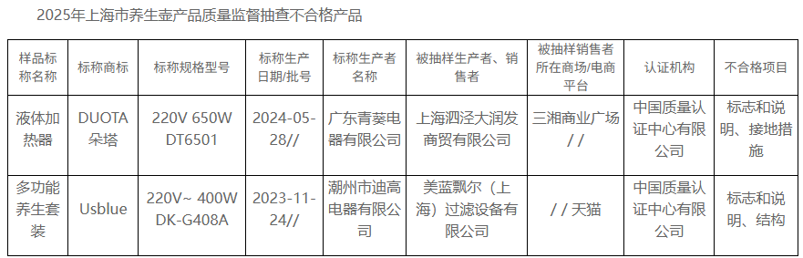 2025年上海市养生壶产品质量监督抽查不合格产品